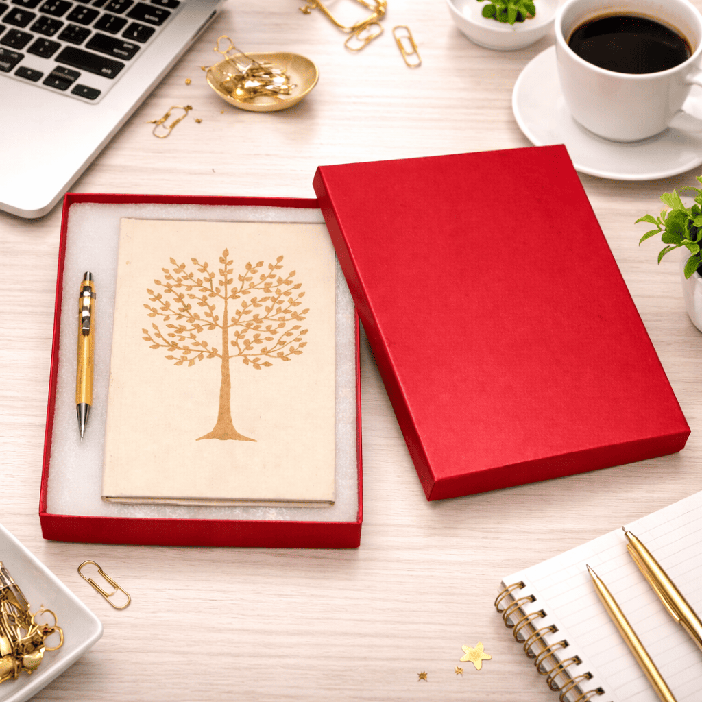 The set also includes a wooden pen, completing the natural and elegant look of the product. Packed in a neat box packaging that can be logo branded, this diary set makes a thoughtful gift for corporate events, conferences, and special occasions while promoting sustainability.