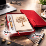 This eco-friendly diary and pen set is thoughtfully crafted for those who value sustainability and natural elegance. The diary features a cover made from natural handmade paper, giving it a unique texture and authentic appearance. Inside, recycled papers are used, making it an environmentally responsible choice for everyday writing.